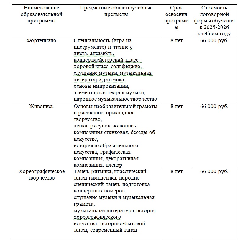 Обучение в Детской школе искусств осуществляется на бюджетной и договорной основе. Увеличение стоимости обучения производится с учетом уровня инфляции, предусмотренного основными характеристиками федерального бюджета на очередной финансовый год и плановый период.