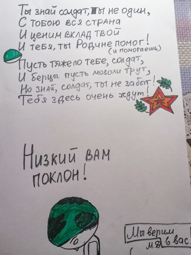 Участники акции собрали не только письма со стихотворениями и рисунками для участников специальной военной операции. На передовую также отправили видео с песнями и танцами, изделия ручной работы. Руководителем акции от команды вуза выступила студентка третьего курса кафедры социально-культурной деятельности Виктория Осинцева. Студентка передала собранные «творческие наборы» в Краснодарский штаб «Мы вместе» для передачи гуманитарной помощи бойцам.