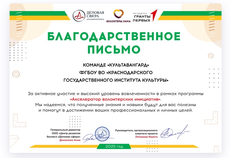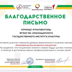 Студенты направления «Управление в креативных индустриях» стали участниками социального проекта «Акселератор волонтерских инициатив международных и межнациональных студенческих команд российских вузов», в рамках которого разработали и представили свой социальный проект «Культурный десант». Завоевав высокую оценку экспертов, команда КГИК получила приглашение на международный слёт волонтёров «Творим добро вместе».