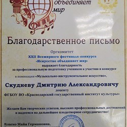 Фестиваль-конкурс «Искусство объединяет мир» помогает творчески одаренным людям реализовать свои таланты и способности. В творческом состязании приняли участие ансамбли и солисты, занимающиеся в детских музыкальных школах, колледжах, вузах. В категории «Инструментальное исполнительство» приняли участие конкурсанты из разных регионов России.