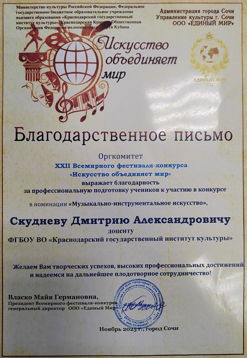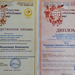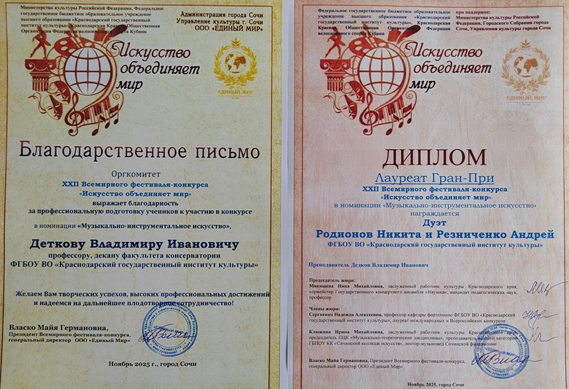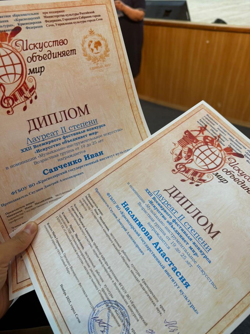 Студенты "Консерватории" Краснодарского государственного института культуры стали победителями и призерами двадцать второго Международного конкурса-фестиваля «Искусство объединяет мир», который прошел в Сочи. Студенты кафедры народных инструментов и оркестрового дирижирования КГИК в рамках конкурсных выступлений показали высокий уровень исполнительского мастерства и получили заслуженные награды.