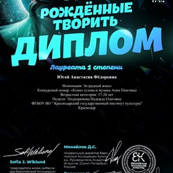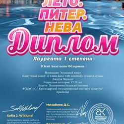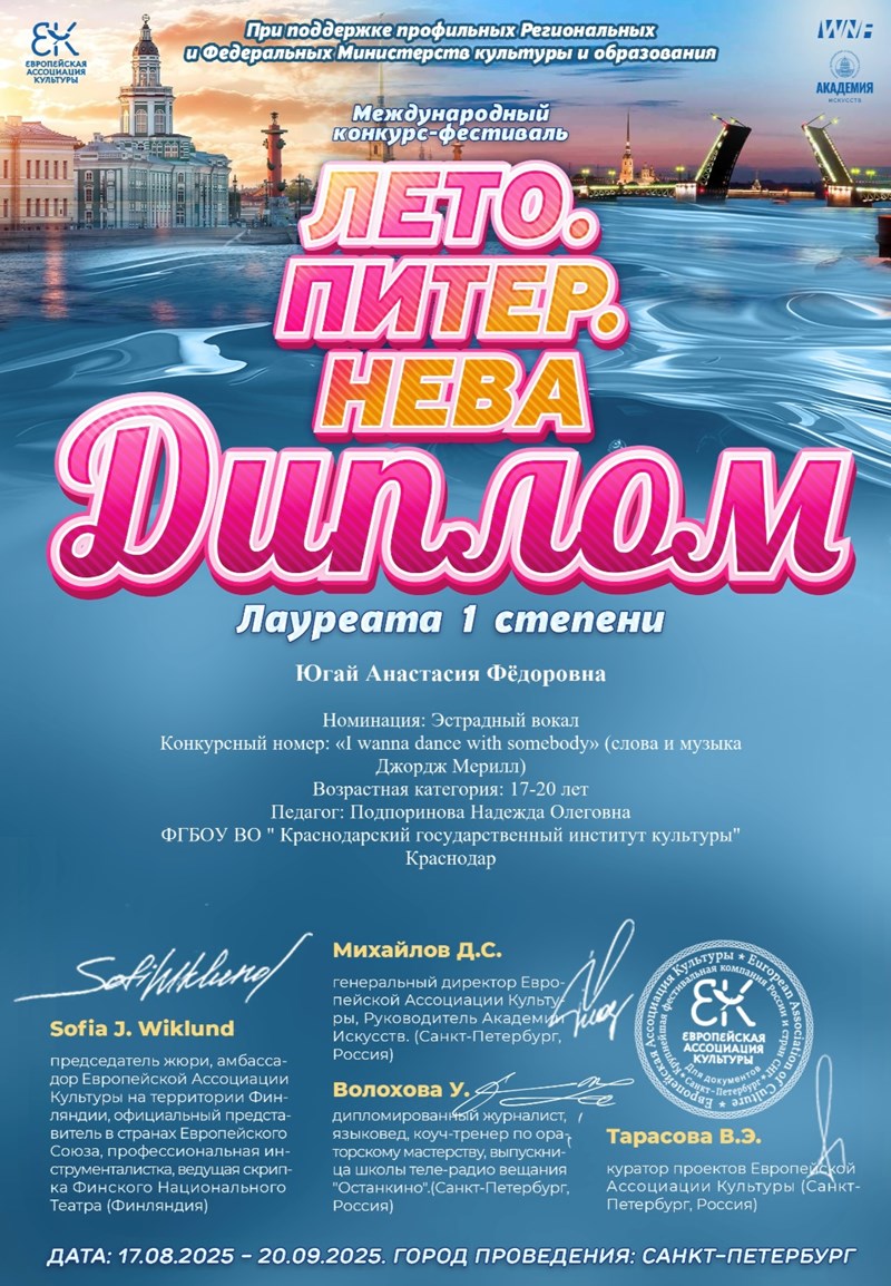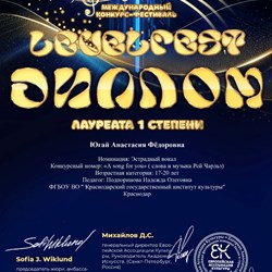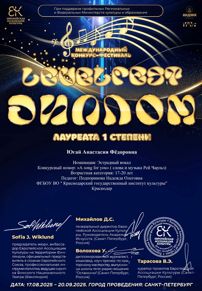 Студентка второго курса кафедры эстрадно-джазового пения Краснодарского государственного института культуры Анастасия Югай победила сразу в трех творческих конкурсах. По результатам каждого из конкурсов Анастасия удостоена звания лауреата первой степени.
