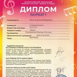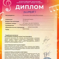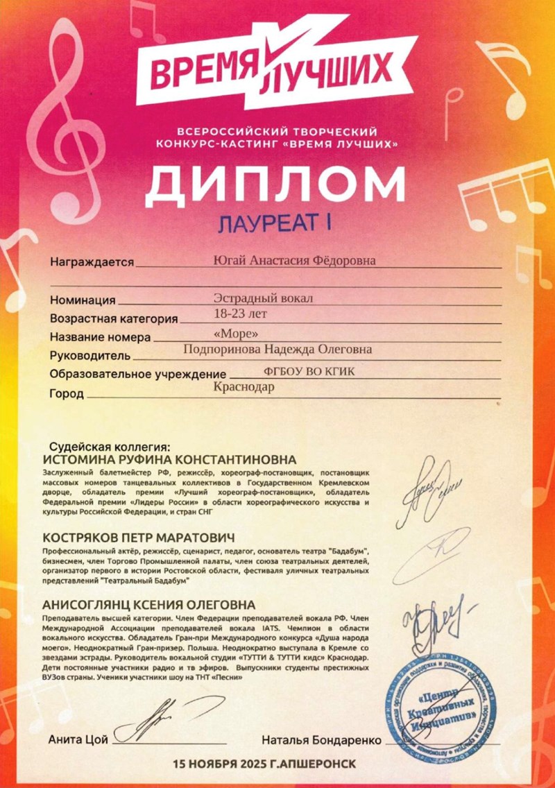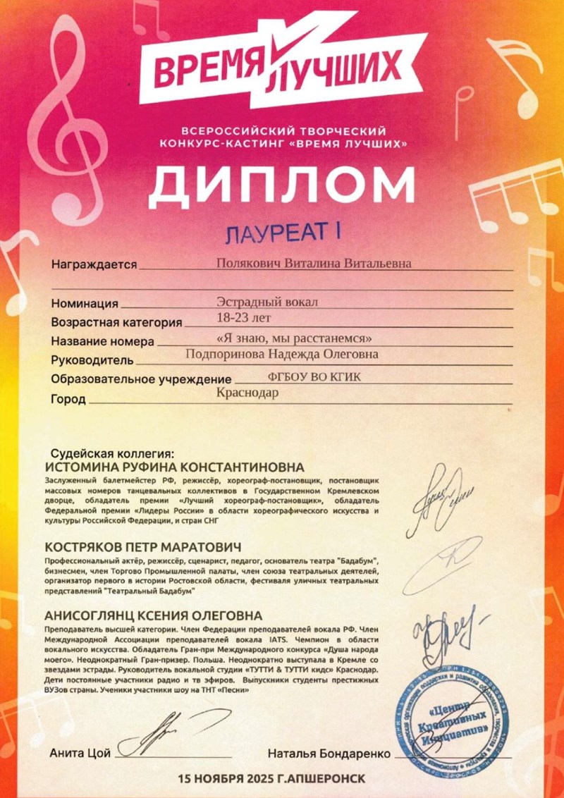 Студентки кафедры эстрадно-джазового пения Краснодарского государственного института культуры стали обладательницами звания лауреатов первой степени Всероссийского творческого конкурса-кастинга «Время лучших», который проходил в очном формате в городе Апшеронске.