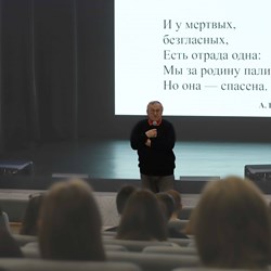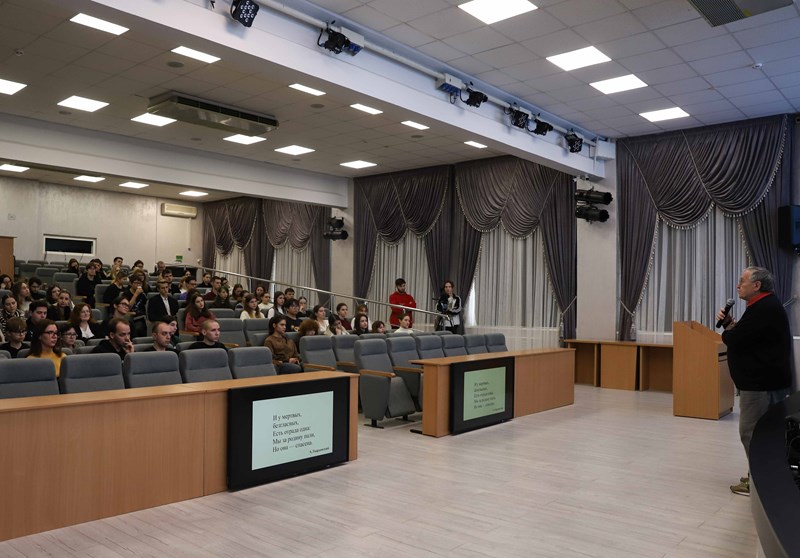 Григорий Григорьевич напомнил студентам о важности сохранения памяти о подвигах солдат, которые отдали свои жизни, защищая Родину. В рамках кинолектория студенты узнали о том, как героизм российского и советского солдата отражен в отечественном кинематографе, и посмотрели несколько фрагментов из фильмов, посвященных этой теме: «Радуга» (1943 год, режиссер Марк Донской), «Они сражались за Родину» Сергея Бондарчука (1975 год), «Рядовой Александр Матросов» (1947 год, режиссер Леонид Луков), фильм Андрея Тарковского «Иваново детство» (1962 год), «Баллада о солдате» (1959 год, режиссер Григорий Чухрай), «Отец солдата» (1964 год, режиссер Резо Чхеидзе), а также «В бой идут одни старики» Леонида Быкова (1973 год).