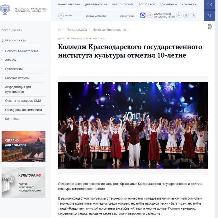 Министерство культуры Российской Федерации "Колледж Краснодарского государственного института культуры отметил 10-летие"