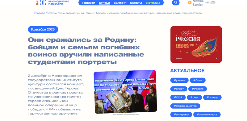 Краснодарские известия: "Они сражались за Родину: бойцам и семьям погибших воинов вручили написанные студентами портреты"