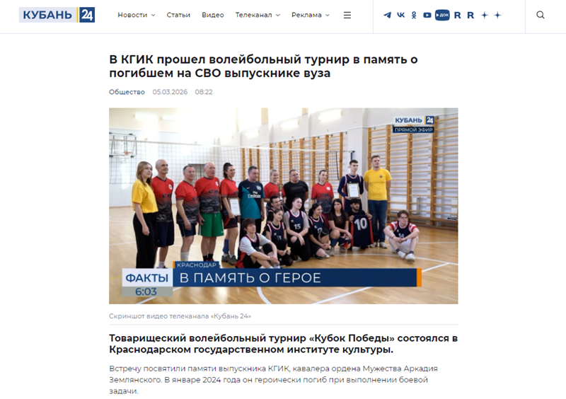 "Кубань 24": "В КГИК прошел волейбольный турнир в память о погибшем на СВО выпускнике вуза"