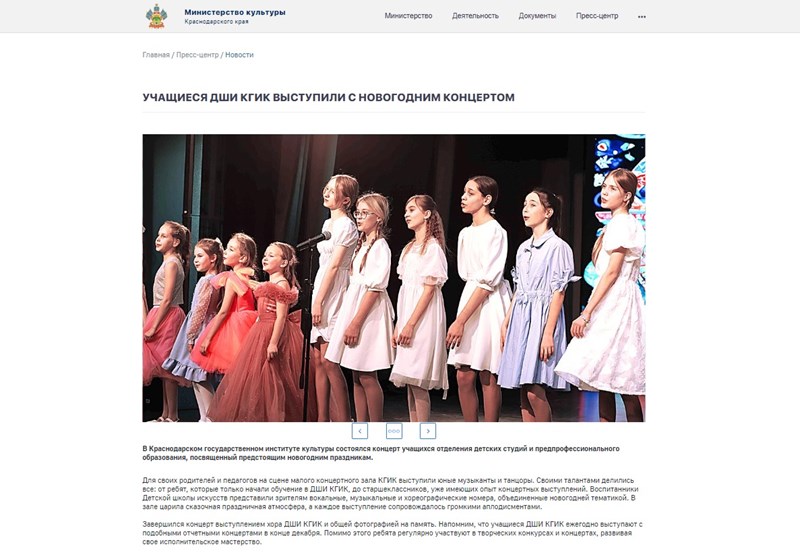 Министерство культуры Краснодарского края: "УЧАЩИЕСЯ ДШИ КГИК ВЫСТУПИЛИ С НОВОГОДНИМ КОНЦЕРТОМ"