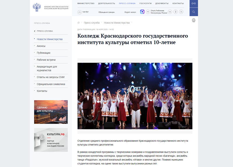 Министерство культуры Российской Федерации "Колледж Краснодарского государственного института культуры отметил 10-летие"