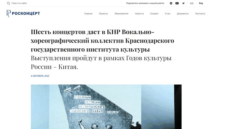 Росконцерт: "Шесть концертов даст в КНР Вокально-хореографический коллектив Краснодарского государственного института культуры Выступления пройдут в рамках Годов культуры России – Китая."