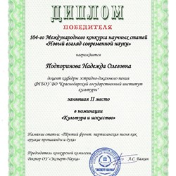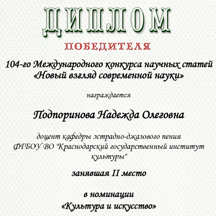 Преподаватель кафедры эстрадно-джазового пения Краснодарского государственного института культуры Надежда Подпоринова стала призером 104-го международного профессионального конкурса научных статей «Новый взгляд современной науки», заняв второе место.