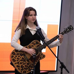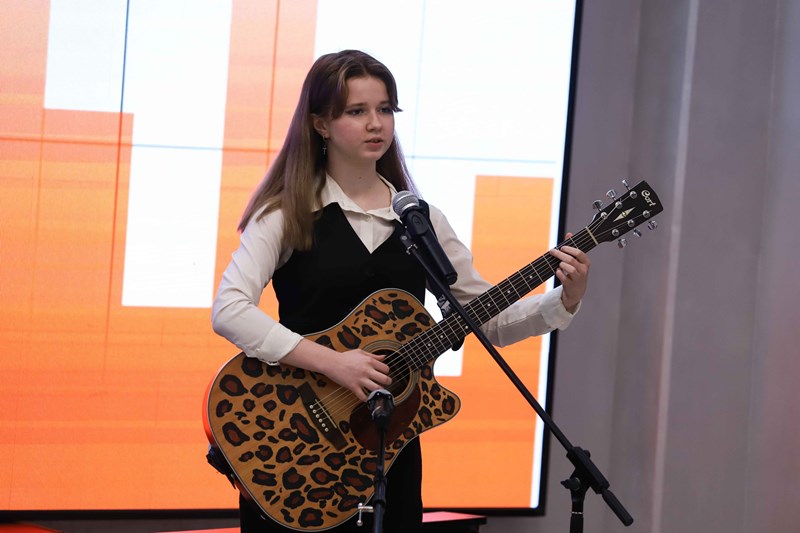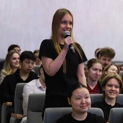Завершилась встреча исполнением авторской песни о жизни вуза, которую написала и исполнила студентка факультета гуманитарного образования Мария Маковецкая.