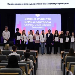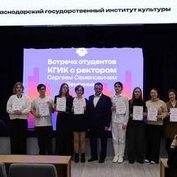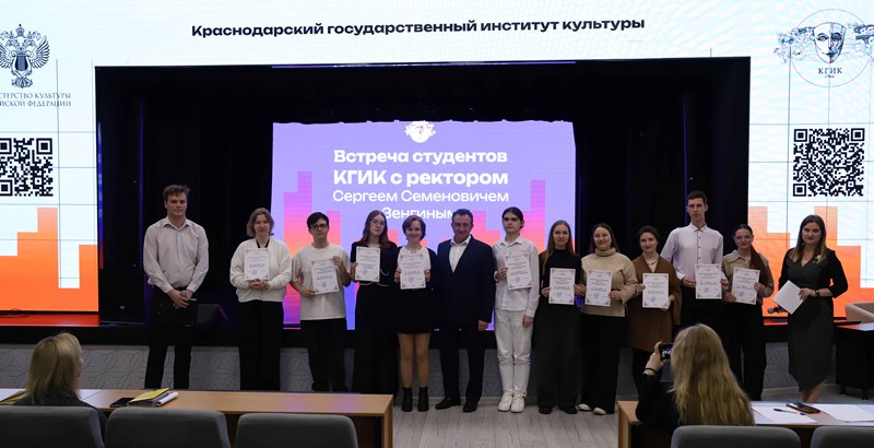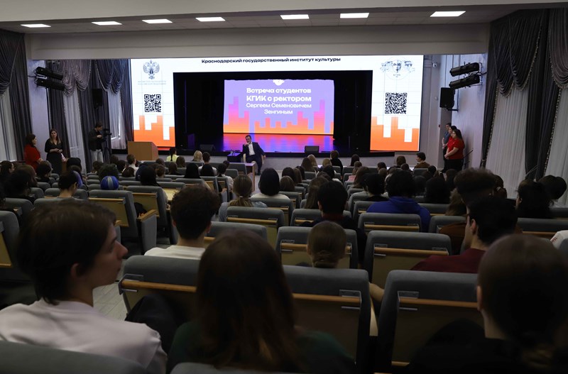 09.04.2026В Краснодарском государственном институте культуры сегодня, 9 апреля, прошла традиционная встреча студентов с ректором вуза Сергеем Зенгиным. Подобные встречи проходят в КГИК ежегодно и являются важной частью взаимодействия студенческого сообщества с руководством вуза. В малом концертном зале собрались студенты отделений высшего и среднего профессионального образования.