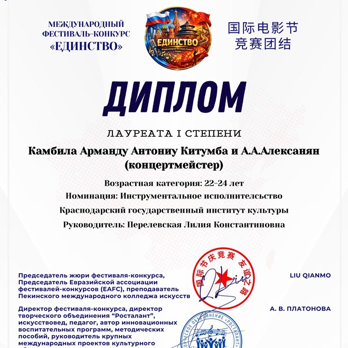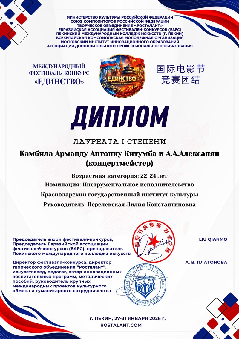 Студент второго курса "Консерватории" Краснодарского государственного института культуры Арманду Антониу Китумба стал лауреатом первой степени в номинации «Инструментальное исполнительство» в Международном фестивале-конкурсе «ЕДИНСТВО», который прошел в Пекине.