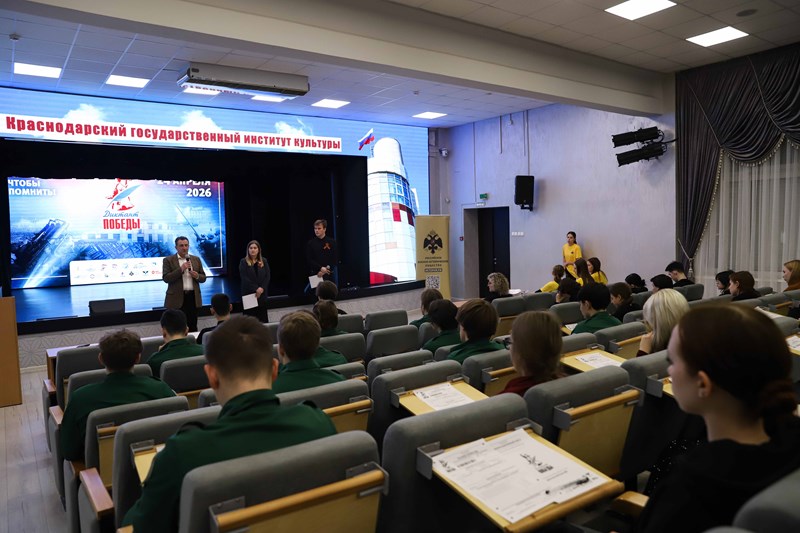 Сегодня, 24 апреля 2026 года, студенты Краснодарского государственного института культуры и учащиеся Музыкального кадетского корпуса имени Александра Невского приняли участие в Международном историческом диктанте на тему событий Великой Отечественной войны «Диктант Победы». В этом году акция посвящена 130-летию со дня рождения Маршала Победы Георгия Константиновича Жукова.