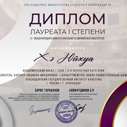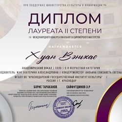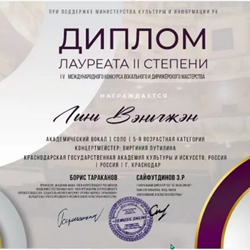 Решением профессионального жюри в номинации "Академический вокал. Соло" в пятой возрастной категории семь талантливых вокалистов из КГИК получили звания лауреатов. Студентка третьего курса Вероника Банарь (концертмейстер - студент третьего курса кафедры фортепиано Ксения Пасочникова, класс профессора Галины Бошук) и ассистент-стажер второго курса Хэ Юйхуа (концертмейстер - Наиля Шамгунова) стали лауреатами первой степени. Обе победительницы учатся в классе профессора Людмилы Косенко. Звание лауреата второй степени получили ученики класса профессора Валентина Косенко Андрей Акопянц, Линь Вэньчжэн и Чжан Цзиньвэй (концертмейстер - Виргиния Путилина), а также ученики класса доцента Екатерины Жук - Анжелика Захарьян (концертмейстер - студент четвертого курса кафедры фортепиано Дарья Дмитриева, класс профессора Галины Бошук) и Хуан Вэньхао (концертмейстер - студент второго курса кафедры фортепиано Елизавета Анохина, класс профессора Галины Бошук). Преподаватели и концертмейстеры также отмечены благодарностями за высокий профессионализм и личный вклад в развитие международной культуры и искусства.