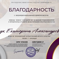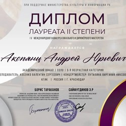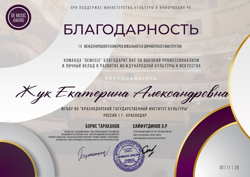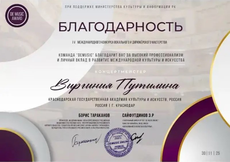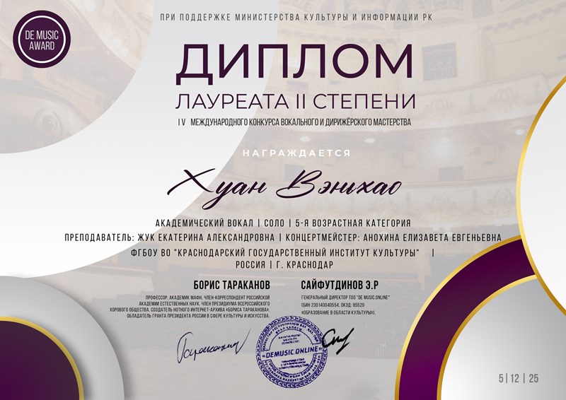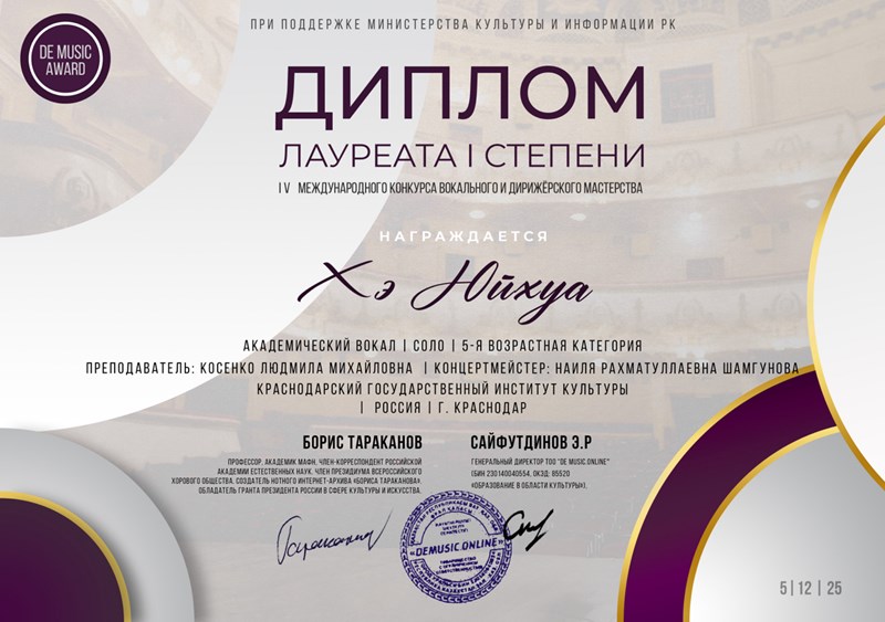 Напомним, что четвертый Международный онлайн-конкурс вокального, ансамблевого и дирижерского мастерства "DE MUSIC AWARD" организован при поддержке Министерства культуры и информации Республики Казахстан и проходил в дистанционном формате. Председателем жюри выступил Борис Игоревич Тараканов – профессор, академик МАФН, член-корреспондент Российской академии естественных наук, член президиума Всероссийского хорового общества, президент Объединённого хорового движения Chorus Inside, обладатель Гранта Президента России в сфере культуры и искусства, создатель крупнейшего нотного интернет-архива «Нотный архив Бориса Тараканова». География участников конкурса охватила различные субъекты РФ, Республику Казахстан, КНР, Республику Беларусь.