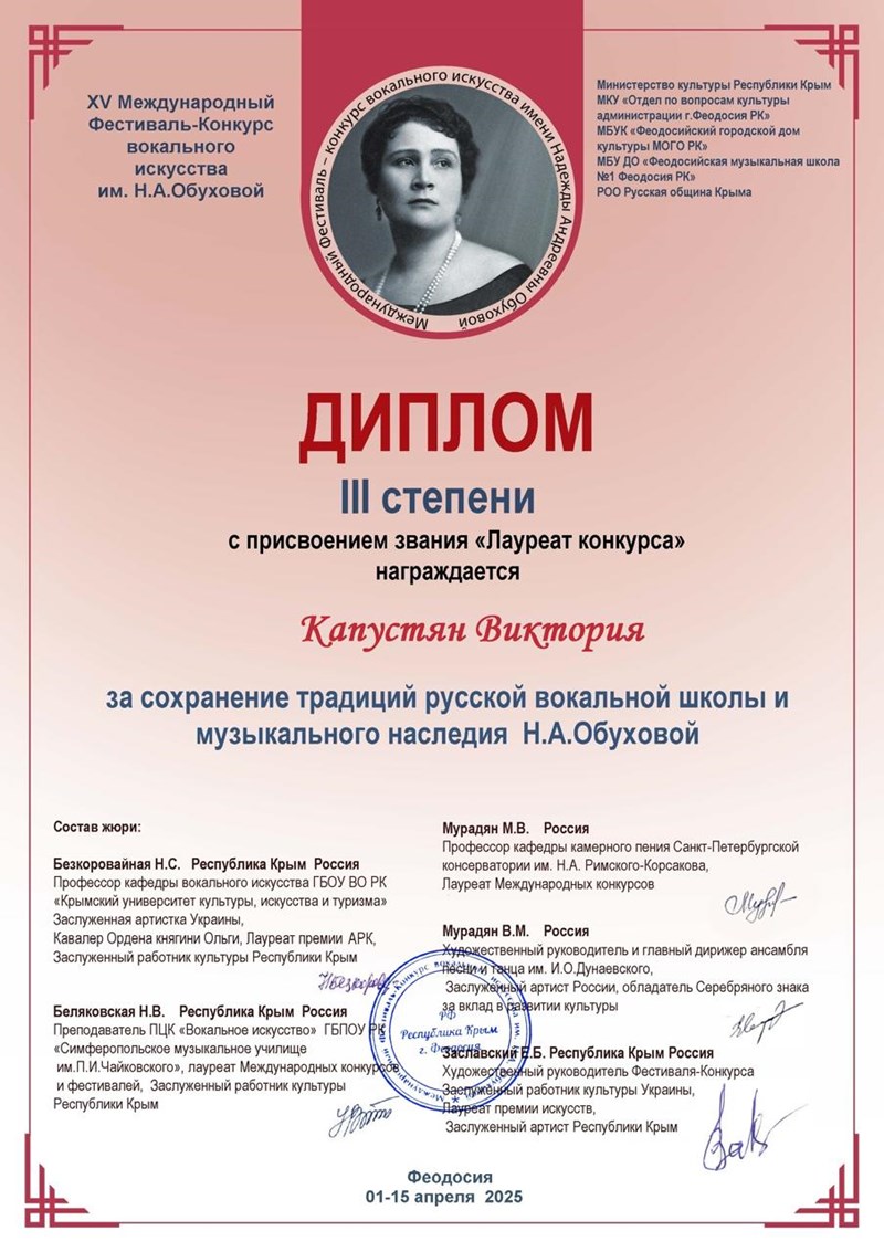 Студенты кафедры академического пения и оперной подготовки имени Николая Кириченко Краснодарско государственного института культуры стали победителями и призерами пятнадцатого Международного фестиваля-конкурса вокального искусства имени выдающейся русской певицы Надежды Обуховой. Конкурс проводился при поддержке Министерства культуры Республики Крым.