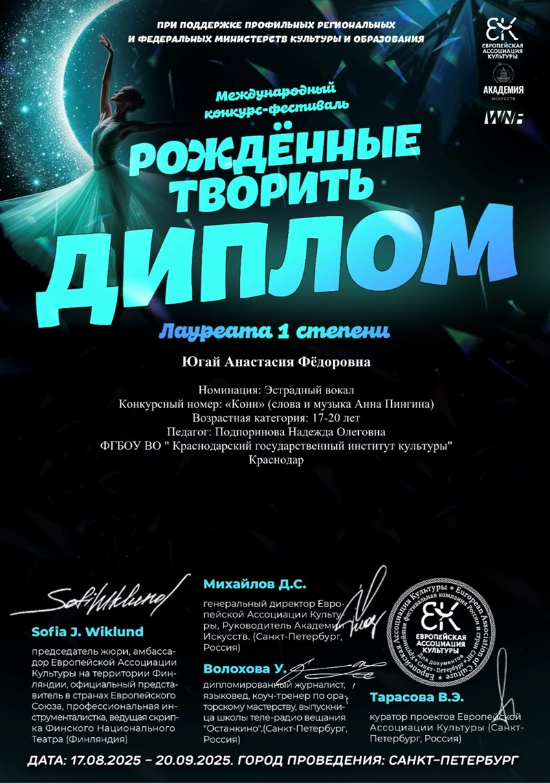 Студентка второго курса кафедры эстрадно-джазового пения Краснодарского государственного института культуры Анастасия Югай победила сразу в трех творческих конкурсах. По результатам каждого из конкурсов Анастасия удостоена звания лауреата первой степени.