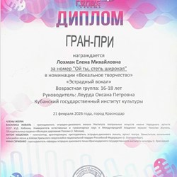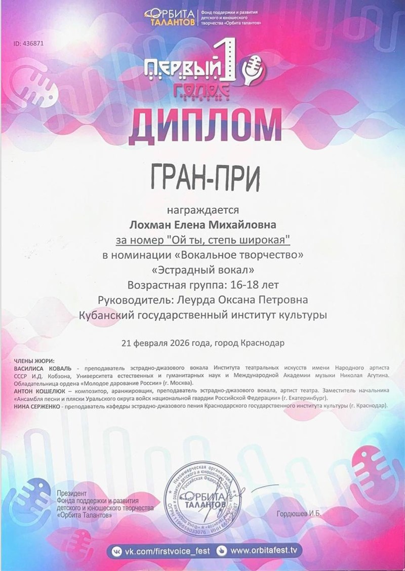 Так первокурсница кафедры ЭДП Елена Лохман стала обладательницей Гран-при вокального конкурса «Первый голос», который организован Фондом поддержки и развития юношеского творчества «Орбита талантов». Подготовку к конкурсу студентка проходила под руководством доцента кафедры ЭДП КГИК Оксаны Леурды.