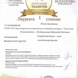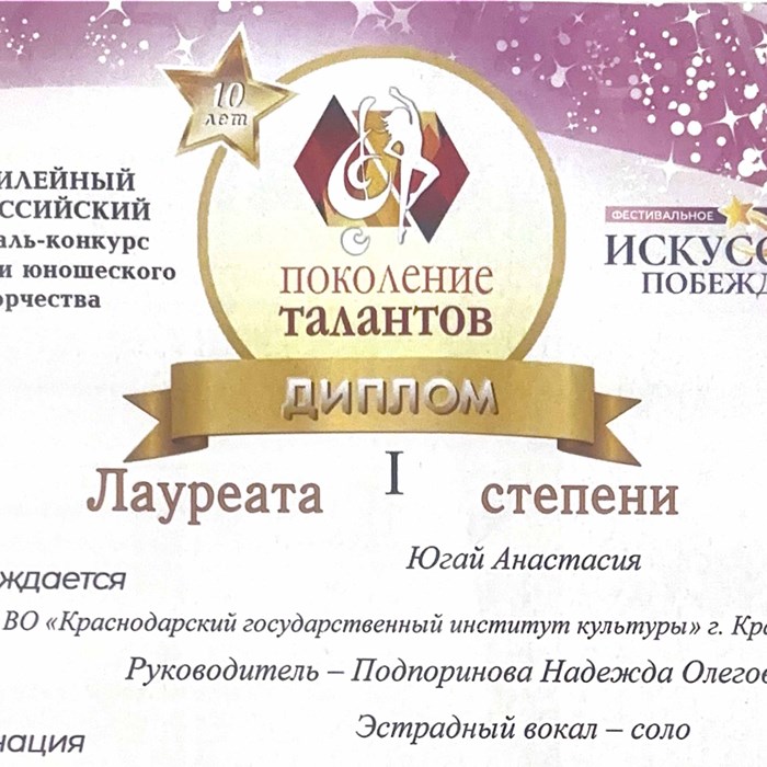 Студентка второго курса Анастасия Югай стала лауреатом первой степени в рамках десятого Всероссийского конкурса-фестиваля юношеского творчества «Поколение талантов», который прошел в Новороссийске. Для участия в конкурсе второкурсница подготовила композицию «Заставь меня дышать» (автор слов — Наталья Тамбовцева, композитор — Леонид Ширин). Высокий уровень исполнительского мастерства Анастасии — результат работы с опытным наставником. Подготовка к конкурсу проходила под руководством педагога кафедры Надежды Подпориновой.