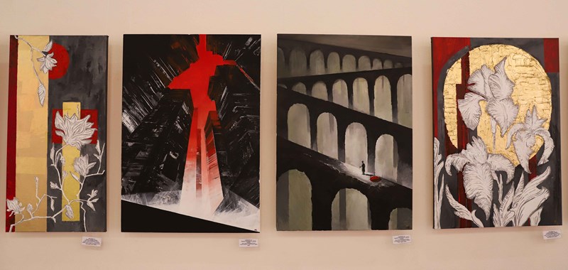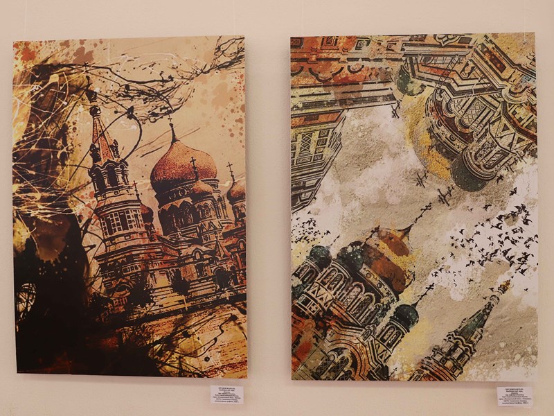 В экспозицию вошли творческие работы преподавателей кафедры дизайна, выполненные в различных стилях и техниках. От сказочных библейских сюжетов и цветочных мотивов, выполненных в уникальной цветовой гамме золота и серебра, до таинственных урбанистических пейзажей, где архитектура то рассыпается как мозаика, то сливается в темные монолитные силуэты на контрасте с багровым закатным небом. Каждая работа привлекала внимание студентов по-своему.