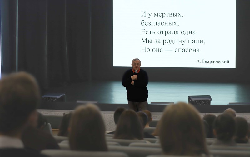 Григорий Григорьевич напомнил студентам о важности сохранения памяти о подвигах солдат, которые отдали свои жизни, защищая Родину. В рамках кинолектория студенты узнали о том, как героизм российского и советского солдата отражен в отечественном кинематографе, и посмотрели несколько фрагментов из фильмов, посвященных этой теме: «Радуга» (1943 год, режиссер Марк Донской), «Они сражались за Родину» Сергея Бондарчука (1975 год), «Рядовой Александр Матросов» (1947 год, режиссер Леонид Луков), фильм Андрея Тарковского «Иваново детство» (1962 год), «Баллада о солдате» (1959 год, режиссер Григорий Чухрай), «Отец солдата» (1964 год, режиссер Резо Чхеидзе), а также «В бой идут одни старики» Леонида Быкова (1973 год).