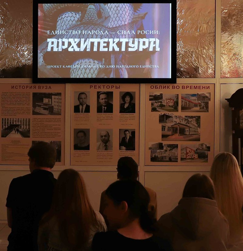 Основной темой выставки стала архитектура России как символ фундамента единого многонационального общества. Проект кафедры дизайна студентам первого курса кафедры истории, культурологии и музееведения презентовала доцент кафедры дизайна КГИК Эллина Мелоян.