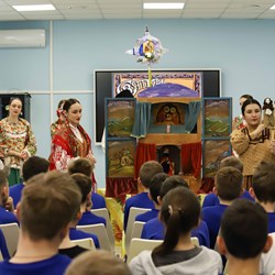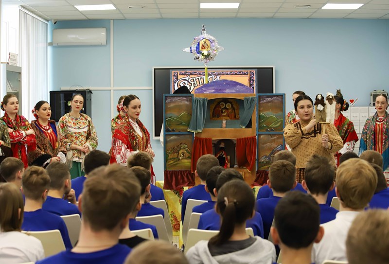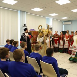 Студенты кафедры сольного и хорового народного пения КГИК выступили перед учащимися отделения детских студий и предпрофессионального образования КГИК и Музыкального кадетского корпуса имени Александра Невского. В ходе игровой программы ребята познакомились с традициями и обычаями празднования Святок, узнали об истории праздника и приняли участие в обрядах и традиционных играх. Насыщенная программа включала в себя песни, щедровки и колядки, вертепное представление, зрители и артисты сыграли в импровизированные снежки, посевали и даже водили "козу".