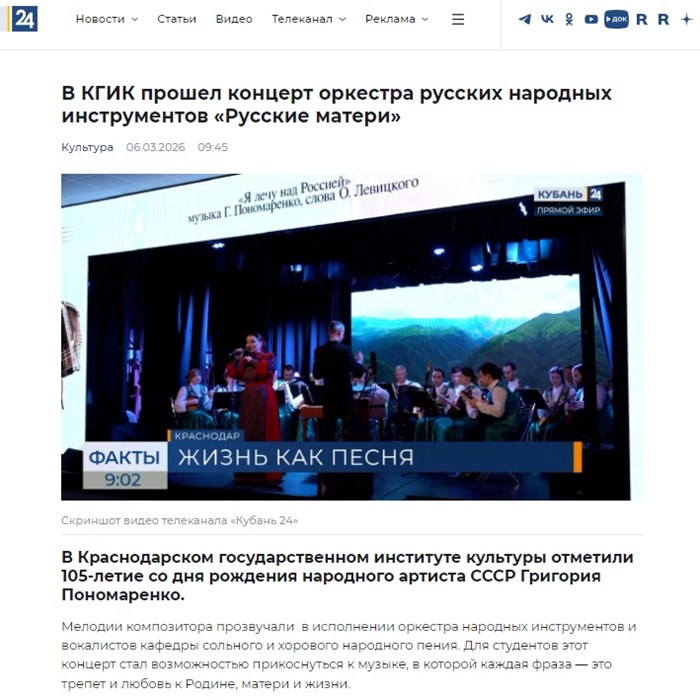 "Кубань 24": "В КГИК прошел концерт оркестра русских народных инструментов «Русские матери»"