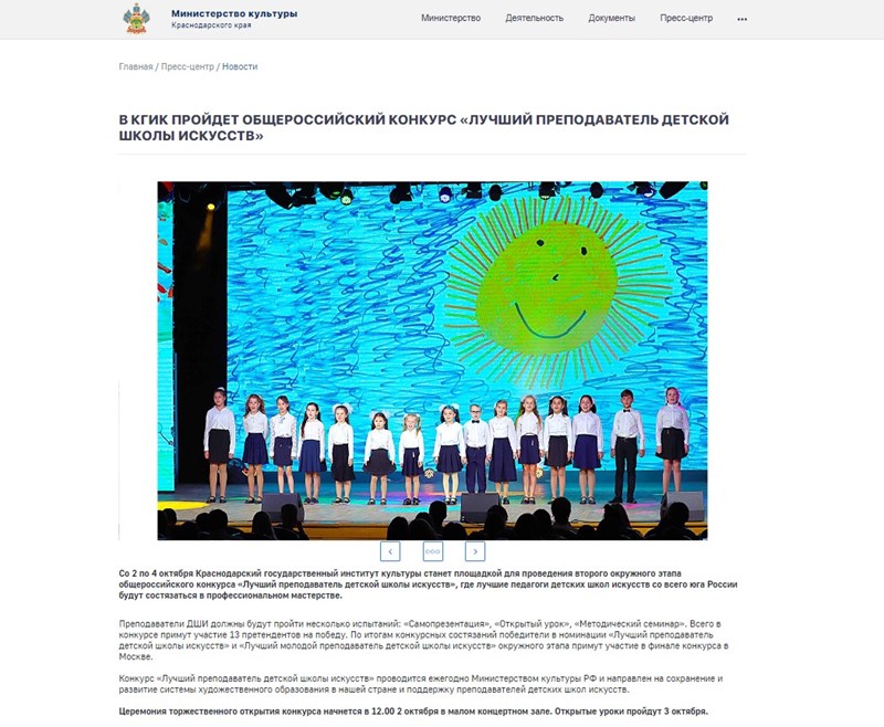 Кубань 24: "В КГИК ПРОЙДЕТ ОБЩЕРОССИЙСКИЙ КОНКУРС «ЛУЧШИЙ ПРЕПОДАВАТЕЛЬ ДЕТСКОЙ ШКОЛЫ ИСКУССТВ»"