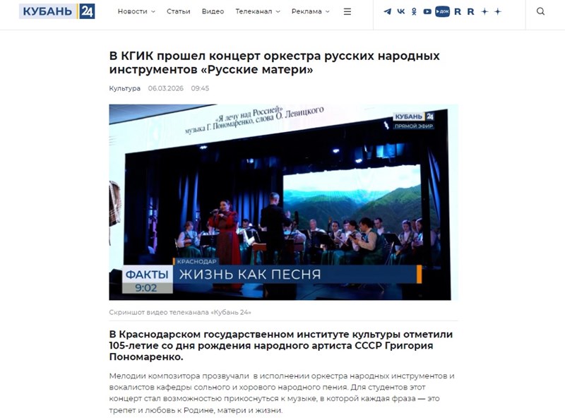 "Кубань 24": "В КГИК прошел концерт оркестра русских народных инструментов «Русские матери»"
