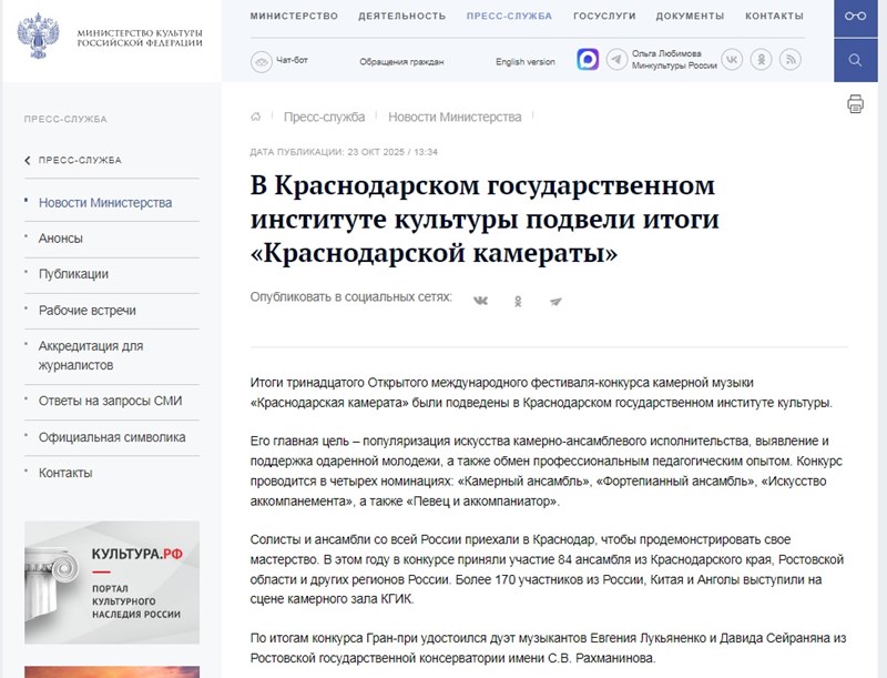 Министерство культуры Российской Федерации: "В Краснодарском государственном институте культуры подвели итоги «Краснодарской камераты»"