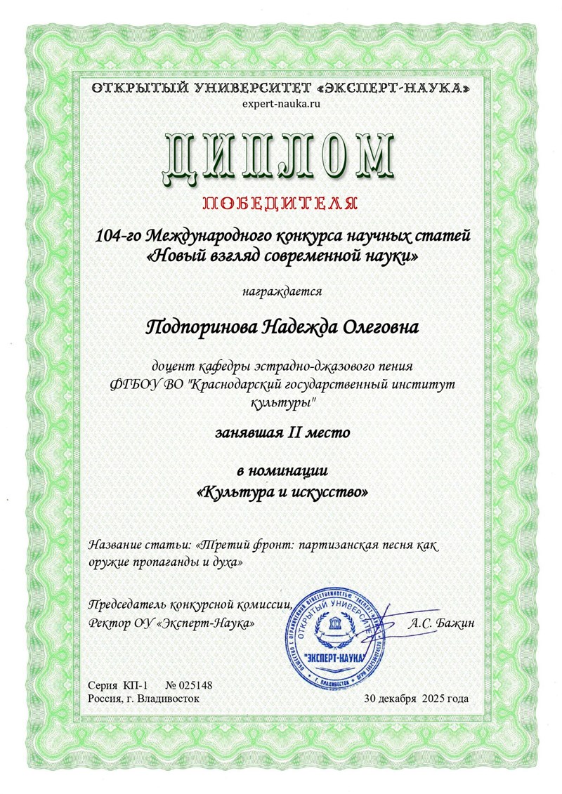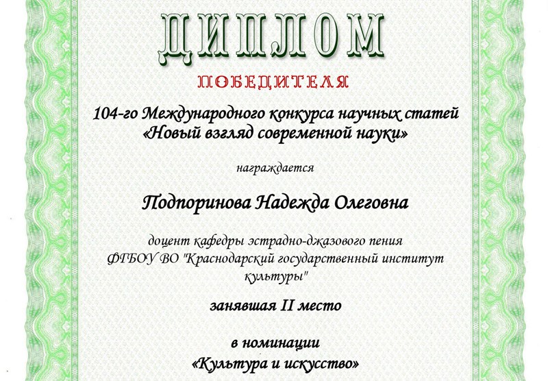 Преподаватель кафедры эстрадно-джазового пения Краснодарского государственного института культуры Надежда Подпоринова стала призером 104-го международного профессионального конкурса научных статей «Новый взгляд современной науки», заняв второе место.