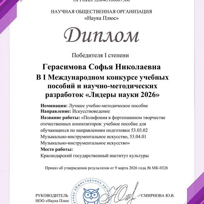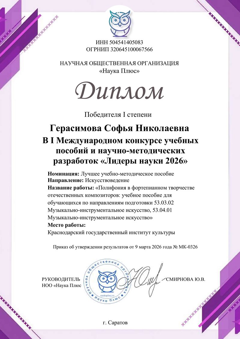 Доцент кафедры фортепиано Краснодарского государственного института культуры Софья Герасимова стала победителем первой степени первого Международного конкурса учебных пособий и научно-методических разработок «Лидеры науки 2026» по направлению «Искусствоведение».