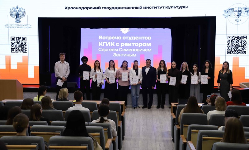 09.04.2026В Краснодарском государственном институте культуры сегодня, 9 апреля, прошла традиционная встреча студентов с ректором вуза Сергеем Зенгиным. Подобные встречи проходят в КГИК ежегодно и являются важной частью взаимодействия студенческого сообщества с руководством вуза. В малом концертном зале собрались студенты отделений высшего и среднего профессионального образования.