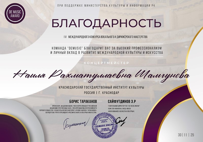 Напомним, что четвертый Международный онлайн-конкурс вокального, ансамблевого и дирижерского мастерства "DE MUSIC AWARD" организован при поддержке Министерства культуры и информации Республики Казахстан и проходил в дистанционном формате. Председателем жюри выступил Борис Игоревич Тараканов – профессор, академик МАФН, член-корреспондент Российской академии естественных наук, член президиума Всероссийского хорового общества, президент Объединённого хорового движения Chorus Inside, обладатель Гранта Президента России в сфере культуры и искусства, создатель крупнейшего нотного интернет-архива «Нотный архив Бориса Тараканова». География участников конкурса охватила различные субъекты РФ, Республику Казахстан, КНР, Республику Беларусь.