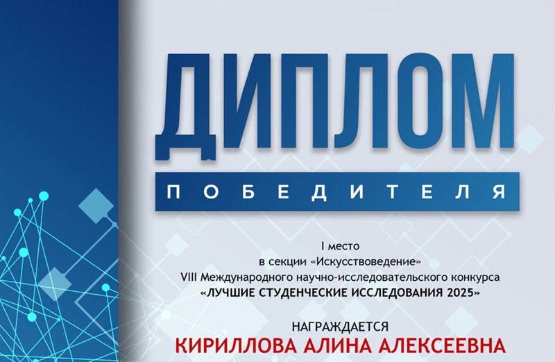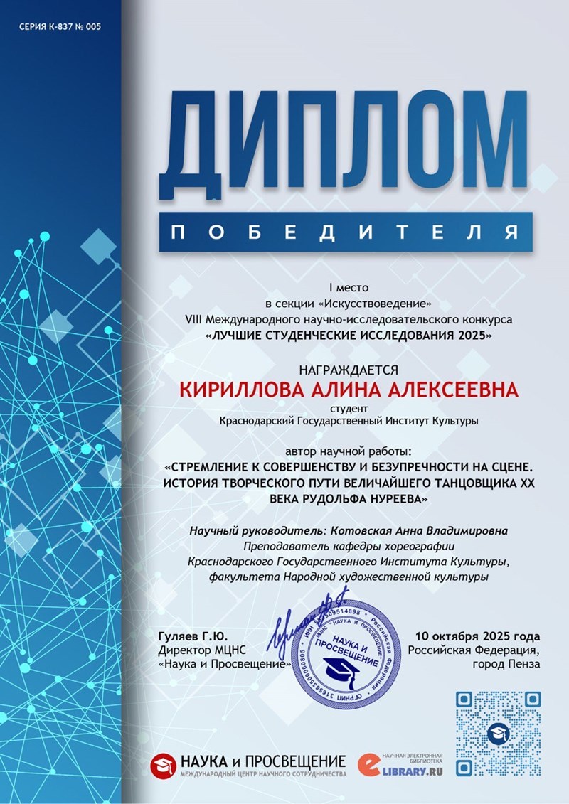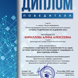 Студентка второго курса кафедры хореографии Краснодарского государственного института культуры Алина Кириллова стала победителем восьмого Международного научно-исследовательского конкурса «Лучшие студенческие исследования 2025».