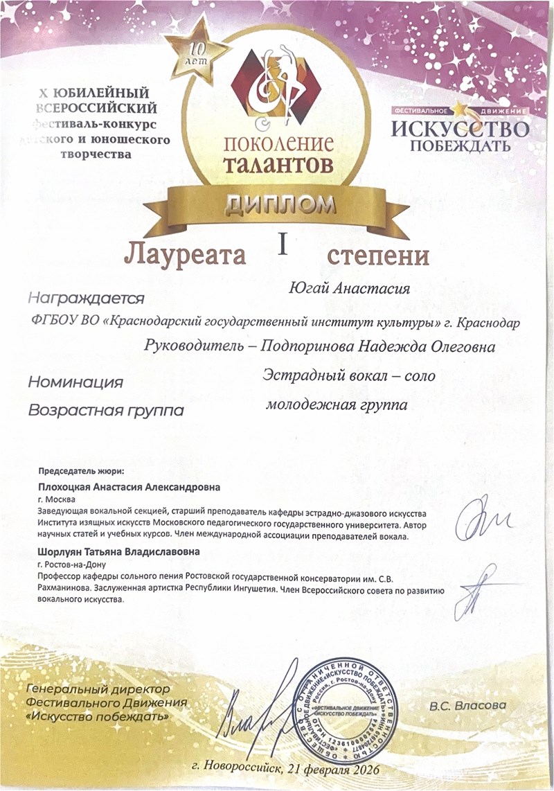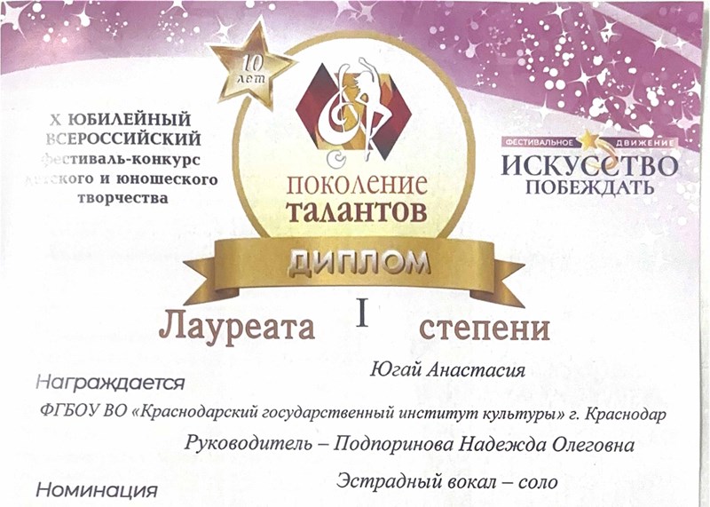 Студентка второго курса Анастасия Югай стала лауреатом первой степени в рамках десятого Всероссийского конкурса-фестиваля юношеского творчества «Поколение талантов», который прошел в Новороссийске. Для участия в конкурсе второкурсница подготовила композицию «Заставь меня дышать» (автор слов — Наталья Тамбовцева, композитор — Леонид Ширин). Высокий уровень исполнительского мастерства Анастасии — результат работы с опытным наставником. Подготовка к конкурсу проходила под руководством педагога кафедры Надежды Подпориновой.