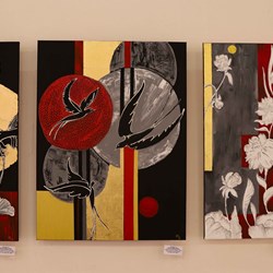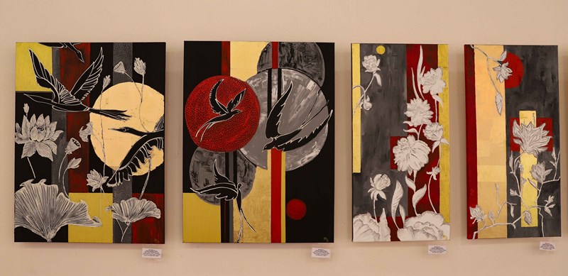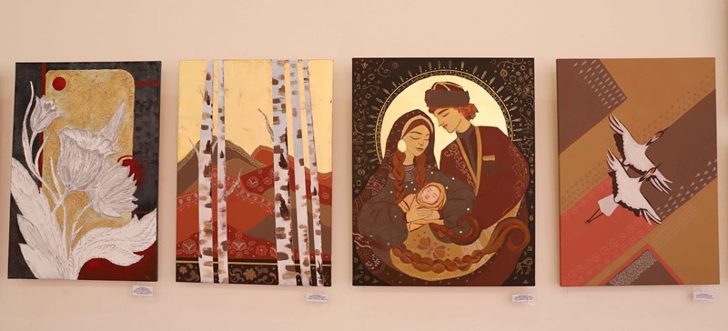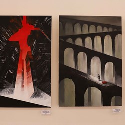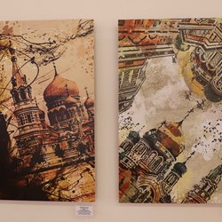 В экспозицию вошли творческие работы преподавателей кафедры дизайна, выполненные в различных стилях и техниках. От сказочных, библейских сюжетов и цветочных мотивов, выполненных в уникальной цветовой гамме золота и серебра, до таинственных урбанистических пейзажей, где архитектура то рассыпается как мозаика, то сливается в темные монолитные силуэты на контрасте с багровым закатным небом. Каждая работа привлекала внимание студентов по-своему.