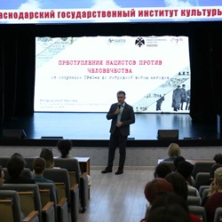 Также в малом концертном зале КГИК сегодня, 17 апреля, прошла публичная лекция ко Дню единых действий в память о геноциде советского народа нацистами и их пособниками в годы Великой Отечественной войны. В рамках лекции прошло открытие выставки «Преступления нацистов против человечества». Перед посетителями лекции выступил руководитель «Центра гражданского воспитания молодежи Кубани» департамента молодежной политики Краснодарского края Иван Сайко, он рассказал о проектах, которые сейчас реализуются в сфере патриотического воспитания.
