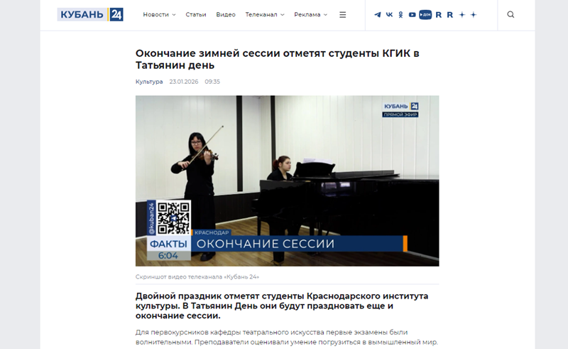 "Кубань 24": "Окончание зимней сессии отметят студенты КГИК в Татьянин день"